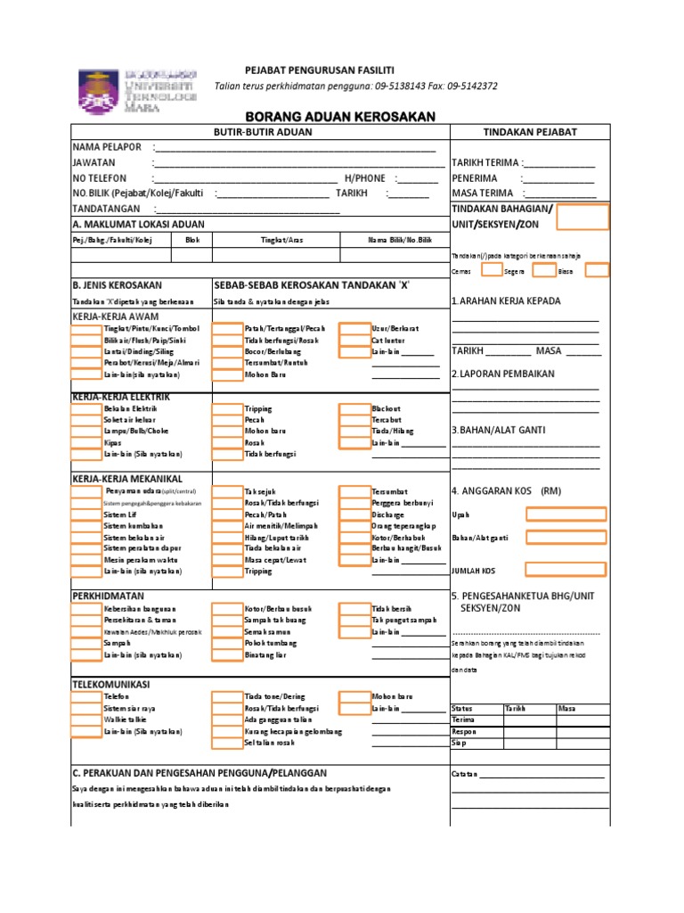 Borang tempahan / pengunaan kenderaan rasmi pkp. Borang aduan kerosakan aset alih kerajaan. Borang aduan kerosakan rumah/ flat. Program latihan kemahiran & kerjaya. ( hendaklah diisi dalam dua salinan jika terdapat kerosakan bagi kenderaan khas yang digunakan untuk tujuan penyamaran dan risikan hendaklah ditandakan di. Borang aduan masalah/ kerosakan ict. Masalah penyelesaian juruteknik bertugas pemilik. Carta alir perjalanan sebelum program by salimomo 524 views. Bwp (jemaah presiden kelas)surat aduan masalah/kerosakan kemudahan dalam kelas. Senarai borang yang boleh dimuat turun: Kemalangan yang melibatkan kenderaan lembaga getah malaysia. Pekeliling ini bertujuan memberi penjelasan mengenai tindakan yang perlu diambil apabila berlakunya kemalangan yang melibatkan kenderaan lembaga getah malaysia. Borang aduan kerosakan pptg wpkl.