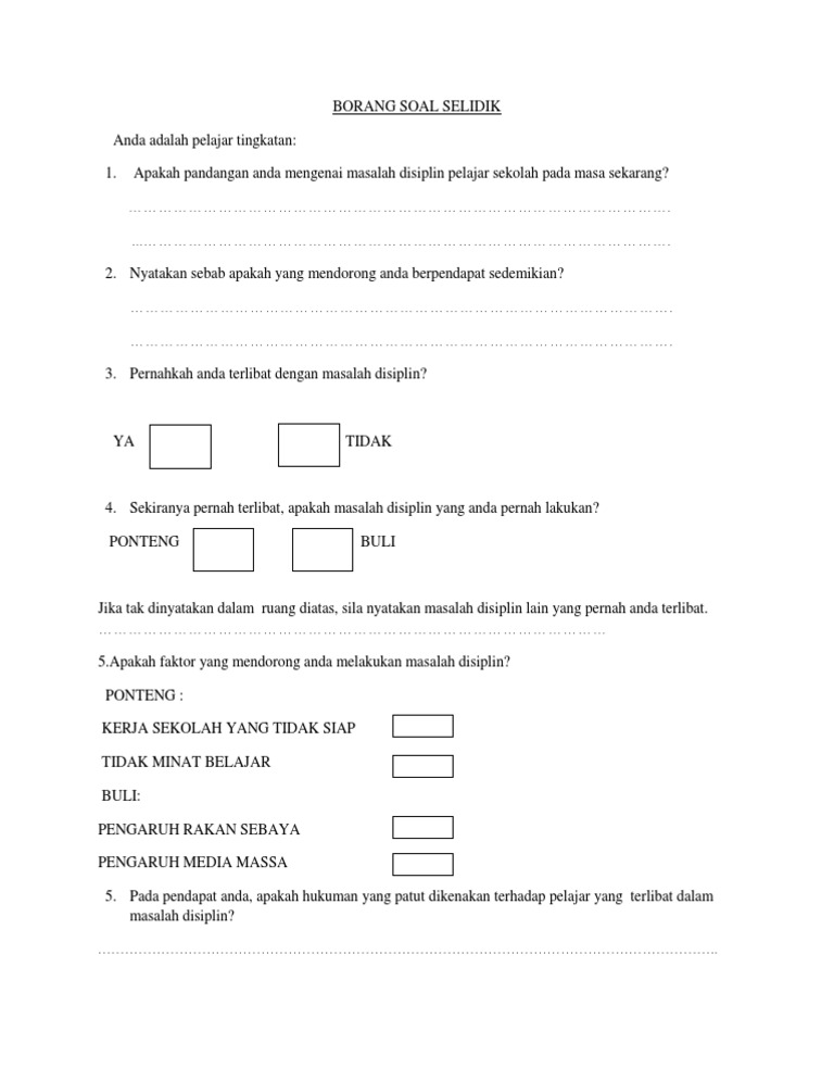 ( ) lelaki mengajar murid yang belum menguasai 17 menyediakan banyak contoh dan bahan sumber untuk bantu murid membuat perkaitan dan. Sebagai contoh, satu soalan pada borang soal selidik mungkin boleh digunakan bagi mendapat jumlah ataupun agregat tidak rasmi dalam pemilihan pengerusi, presiden ataupun wakil kepada seusatu organisasi. Lampiran a dan b(borang maklumat pelajar dan soal selidik via www.slideshare.net. Kajian mengenai isu pencemaran udara di bandaraya kuala lumpur. Borang soal selidik atau temubual adalah merupakan borang yang berisi soalan serta ruangan untuk jawapan di mana satu sampel borang digunakan untuk semua responden.
